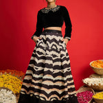 Black Velvet Peter Pan Crop Top With Anarkali Skirt , in Velvet fabric, Cotton Lining, Crop Length , Fit & Flare , Zipper Closure , Straight Hemline and features Embroidery Detail At Neck & Sleeves