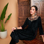 Women Black Velvet Side Pocket Embroidered Straight Kurta