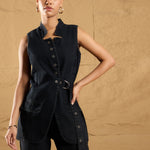 Black Wash Denim Eyelet Sleeveless Jacket, in Denim fabric, Unlined, Regular Length, Comfort Fit, Button Closure, Straight Hemline and features Belt Detail At Front