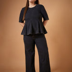 Black Wash Denim Peplum Top With Straight Pants, in Denim fabric, Unlined , Regular Length, Straight Fit, Zipper Closure, Straight Hemline and features Side Inlay Pockets Detail