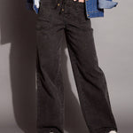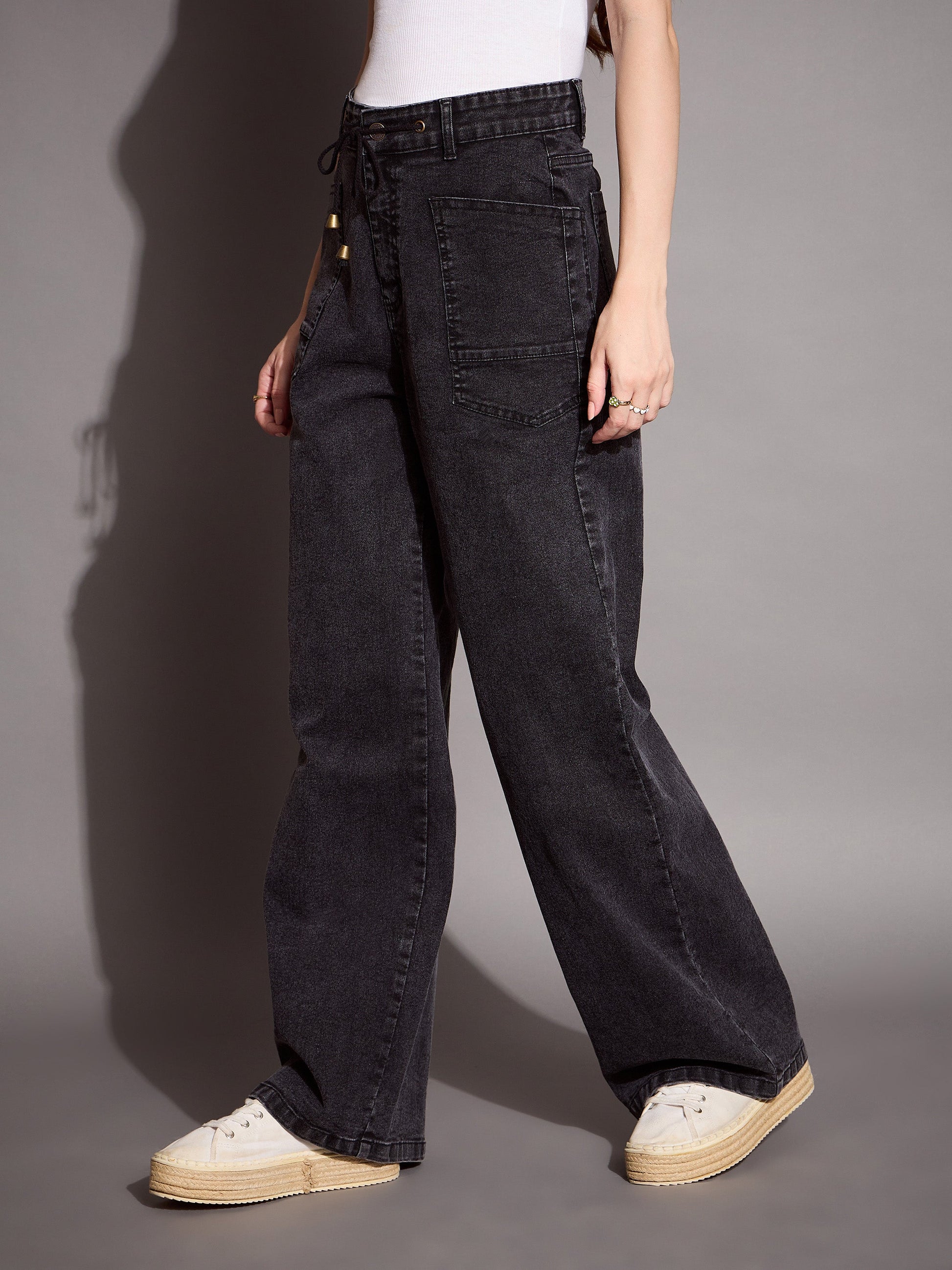 Black Wash Patch Pocket Straight Jeans , in Denim fabric, Unlined, Full Length, Straight Fit, Button Closure, Straight Hemline and features Drawstring with Metal Trim Detail