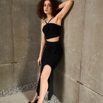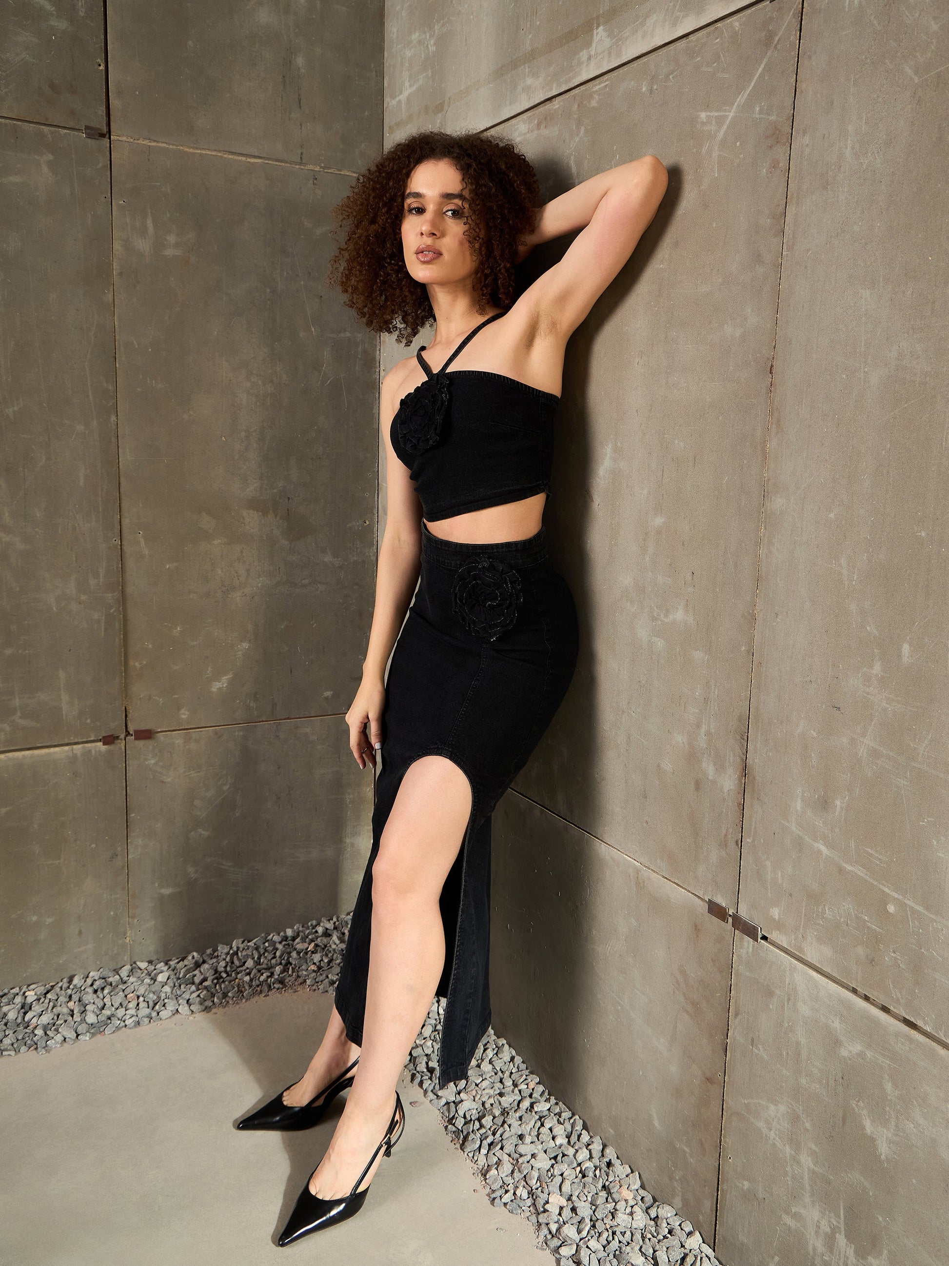 Women Black Washed Denim Corsage Crop Top With Skirt