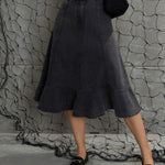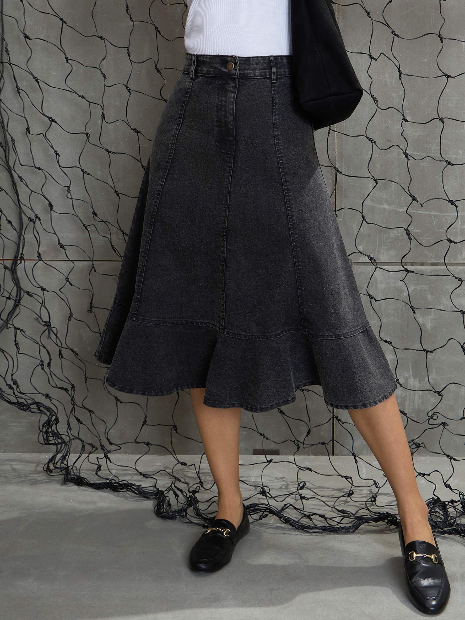 Black Washed Denim Flared Hem Skirt , in Denim fabric, Unlined, Below Knee, Comfort Fit, Zipper Closure, Straight Hemline and features Frill At Hem