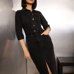Black Washed Denim Front Slit Midi Dress, in Denim fabric, Unlined, Below Knee, Comfort Fit, Button Closure, Straight Hemline and features Patch Pocket At Front