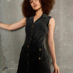 Black Washed Denim Notch Collar Short Dress, in Denim fabric, Unlined, Short Length, Straight Fit, Button Closure, Straight Hemline and features Button Detail At Front