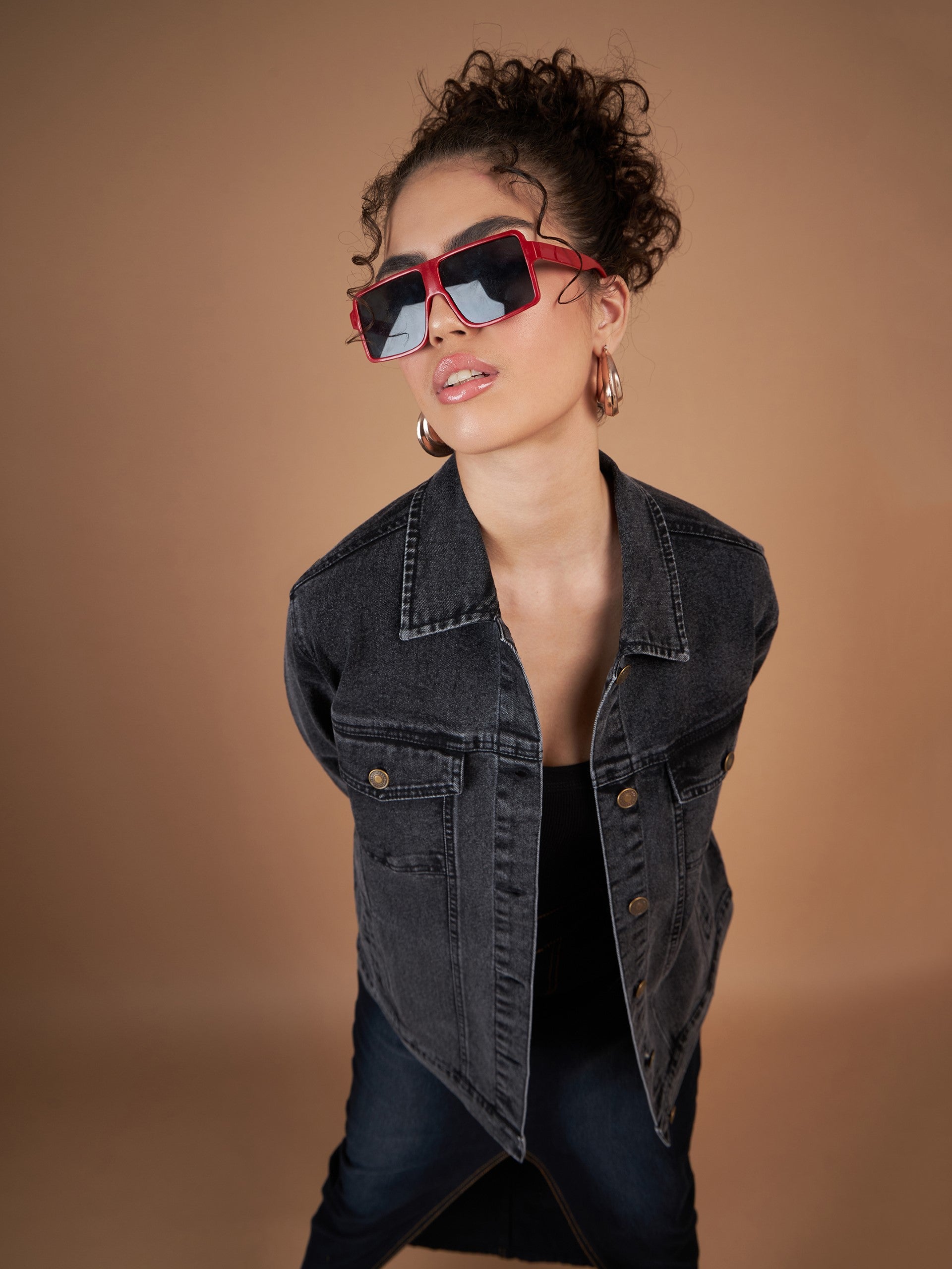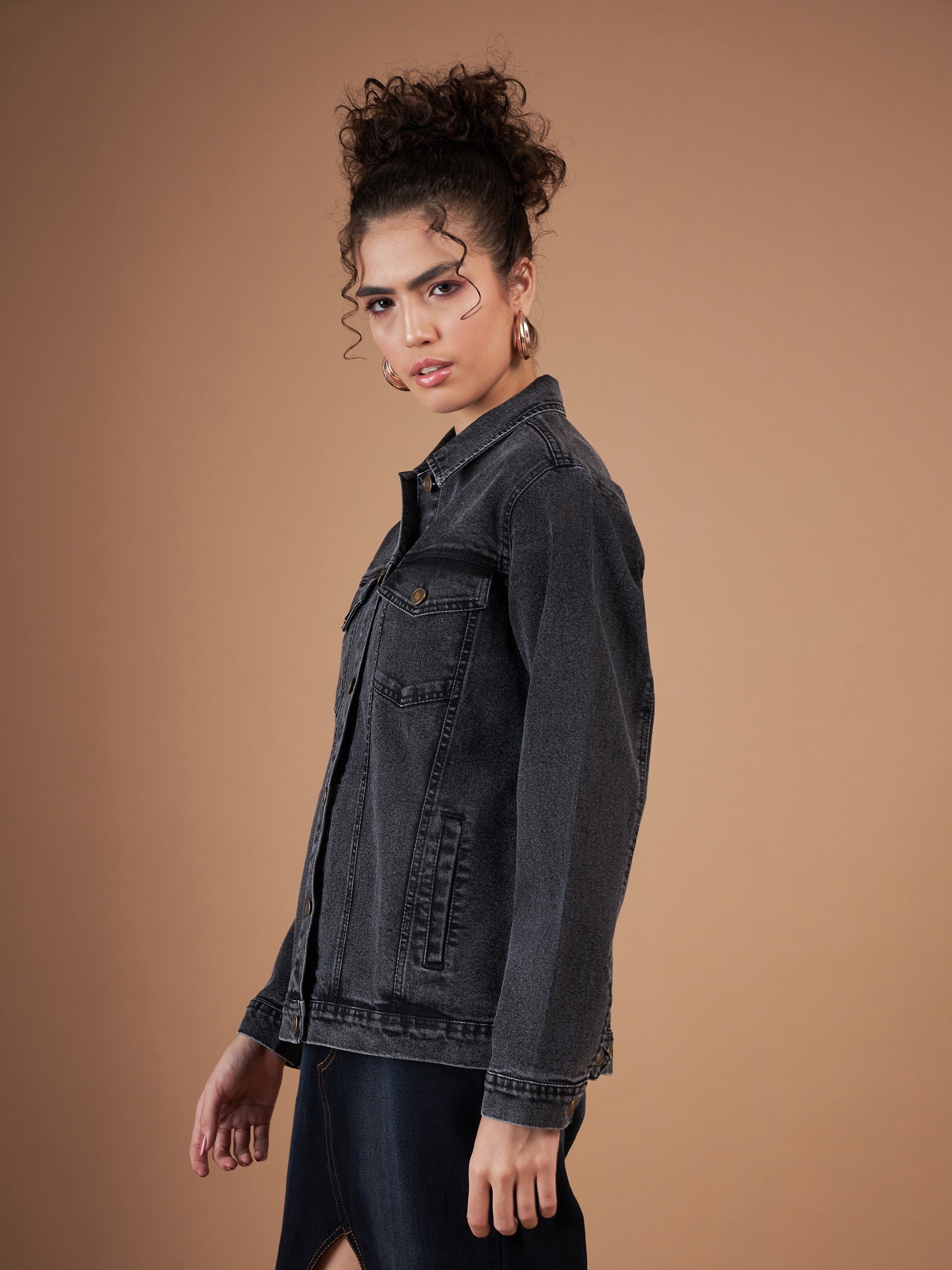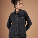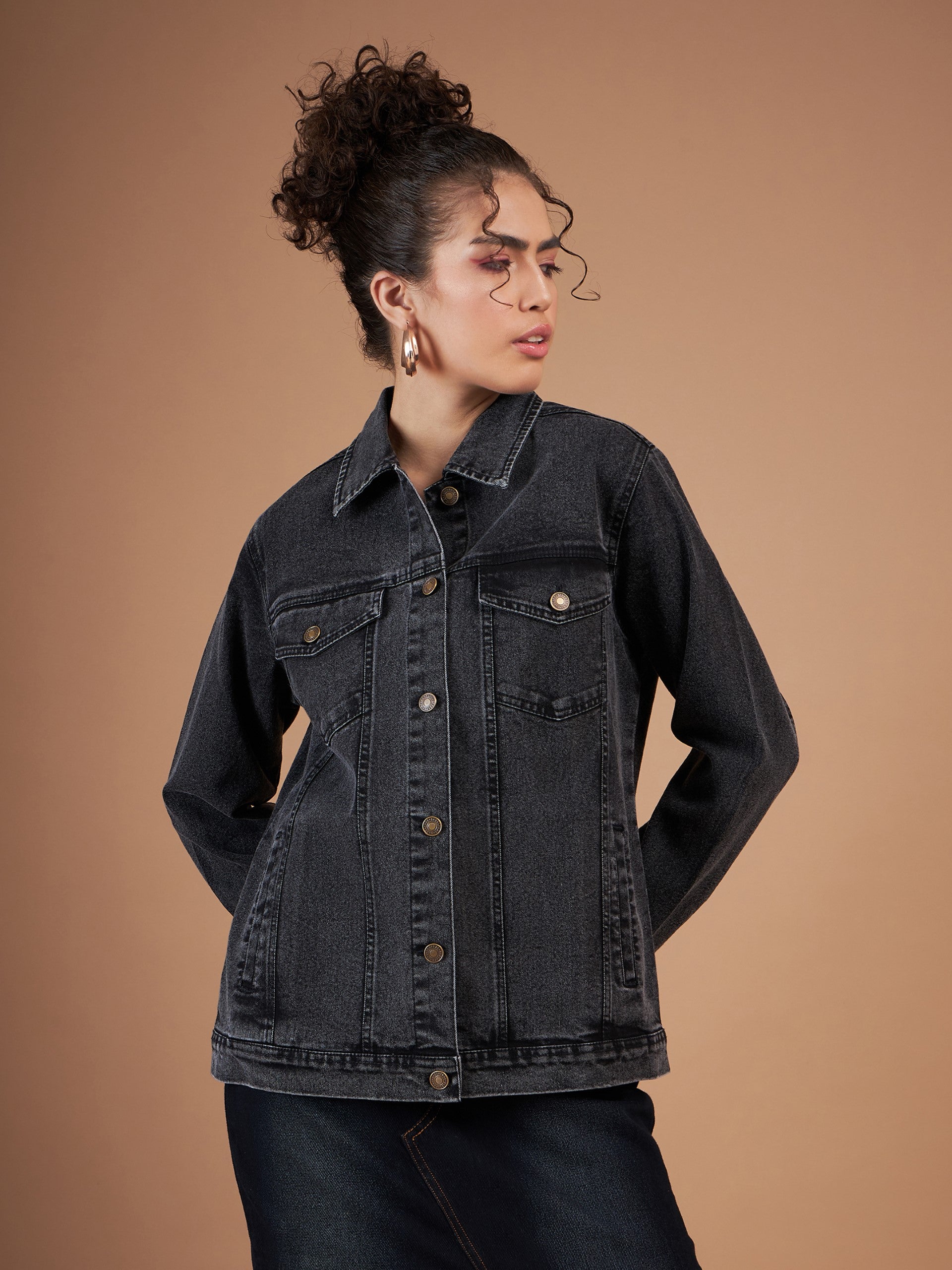 Black Washed Denim Oversized Jacket, in Denim fabric, Unlined, Regular Length, Comfort Fit, Button Closure, Straight Hemline and features Flap Pocket Detail At Front