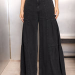 Black Washed Gathered Front Flared Jeans, in Denim fabric, Unlined, Full length, Comfort Fit, Slip On, Straight Hemline and features Gathers At Front