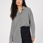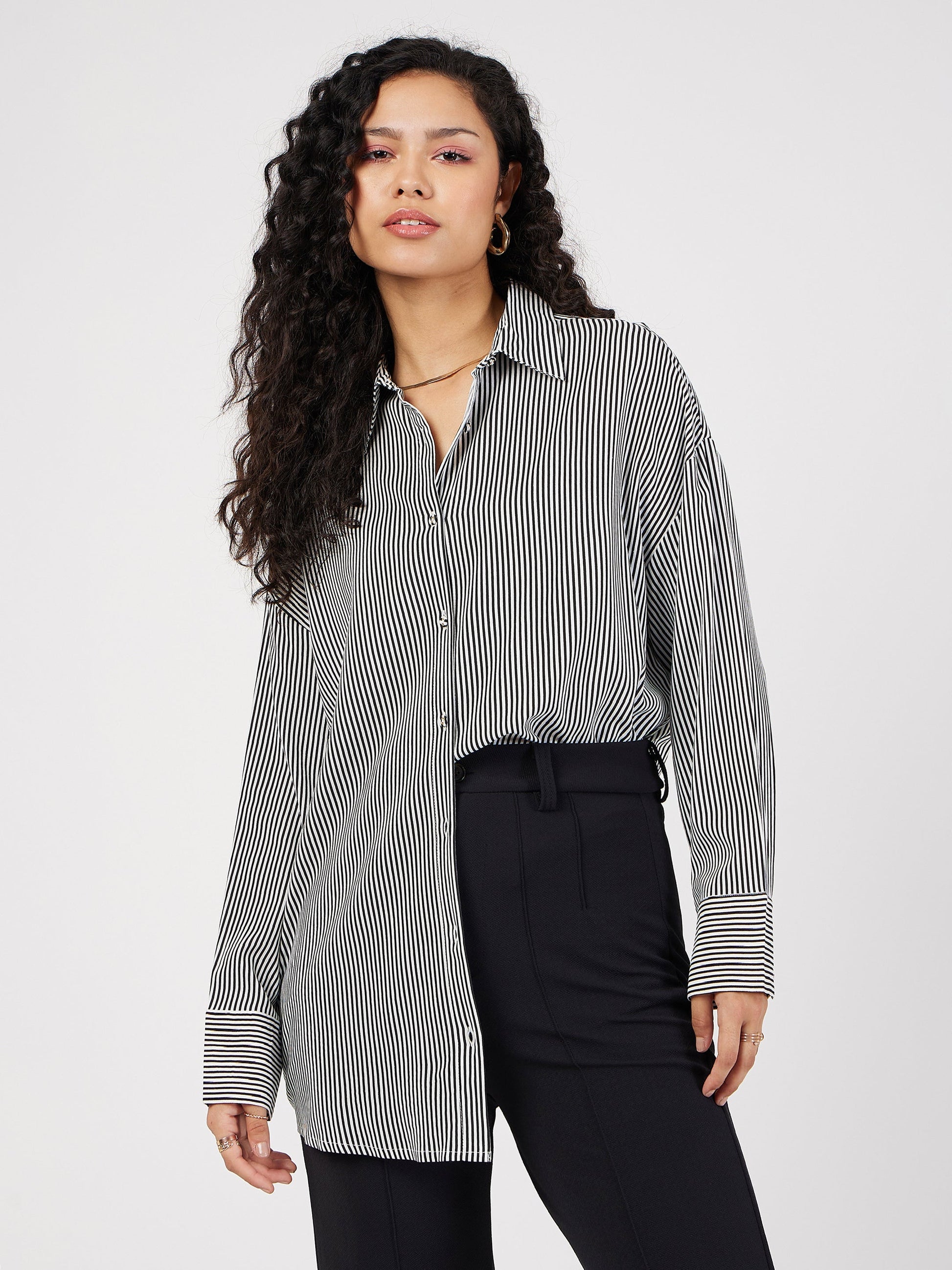 Black & White Pinstriped Oversize Shirt, in Rayon fabric, Unlined, Regular Length, Loose Fit, Button Closure, Curved Hemline and features Elastic Detail At Back Waist