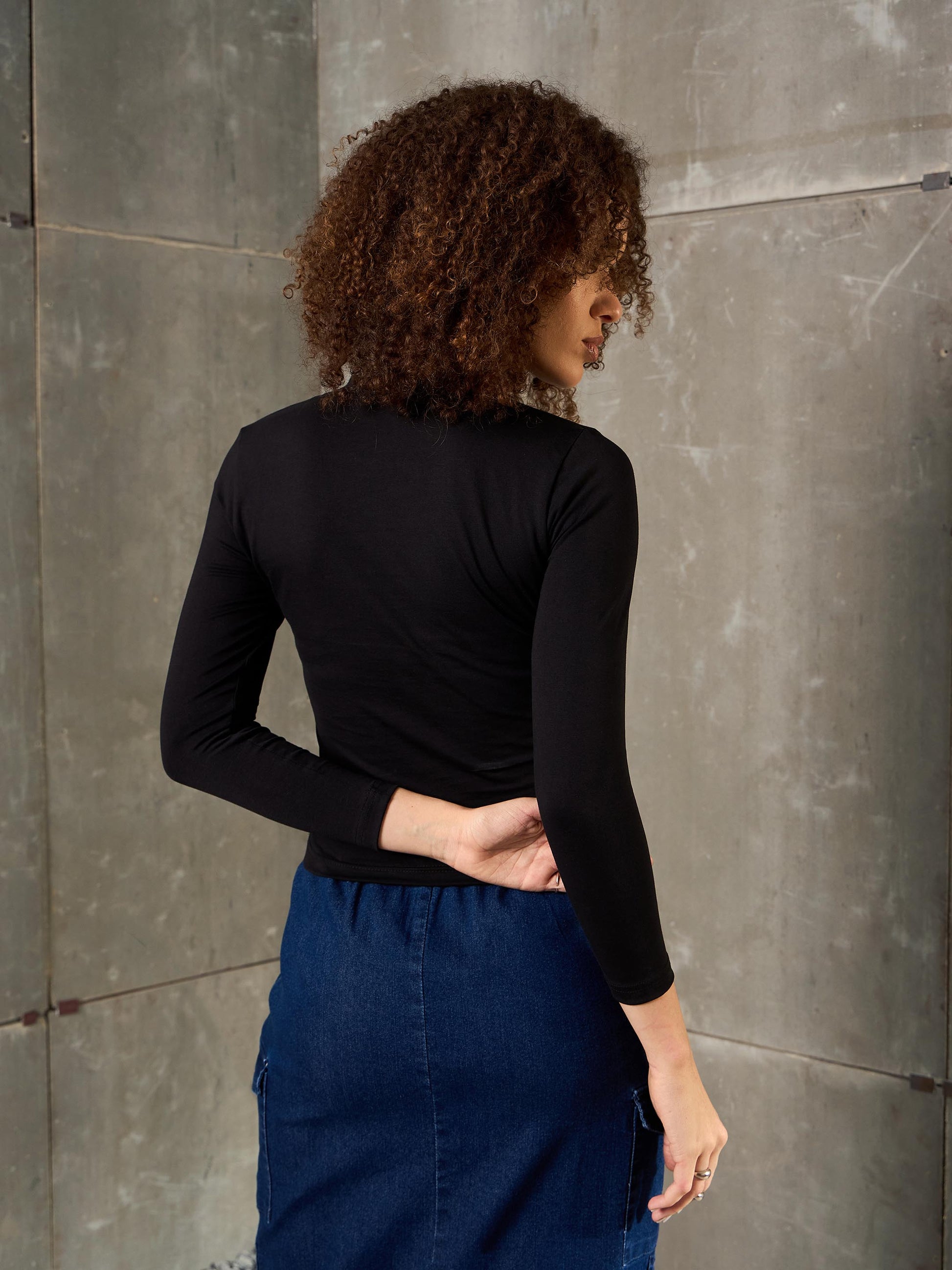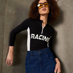 Black & White RACING High Neck Fitted T-Shirt, in Cotton Jersey fabric, Unlined, Crop Length, Slim Fit, Zipper Closure, Straight Hemline and features Print At Front