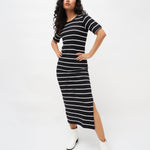 Black White Stripe Maxi, in Cotton Spandex fabric, Unlined, Full Length, Slim Fit, No Closure, Straight Hemline and features Slit at side