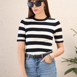 Black & White Striped Acrylic Top, in Viscose Nylon fabric, NA, Regular Length, Regular Fit, No Closure, Straight Hemline and features