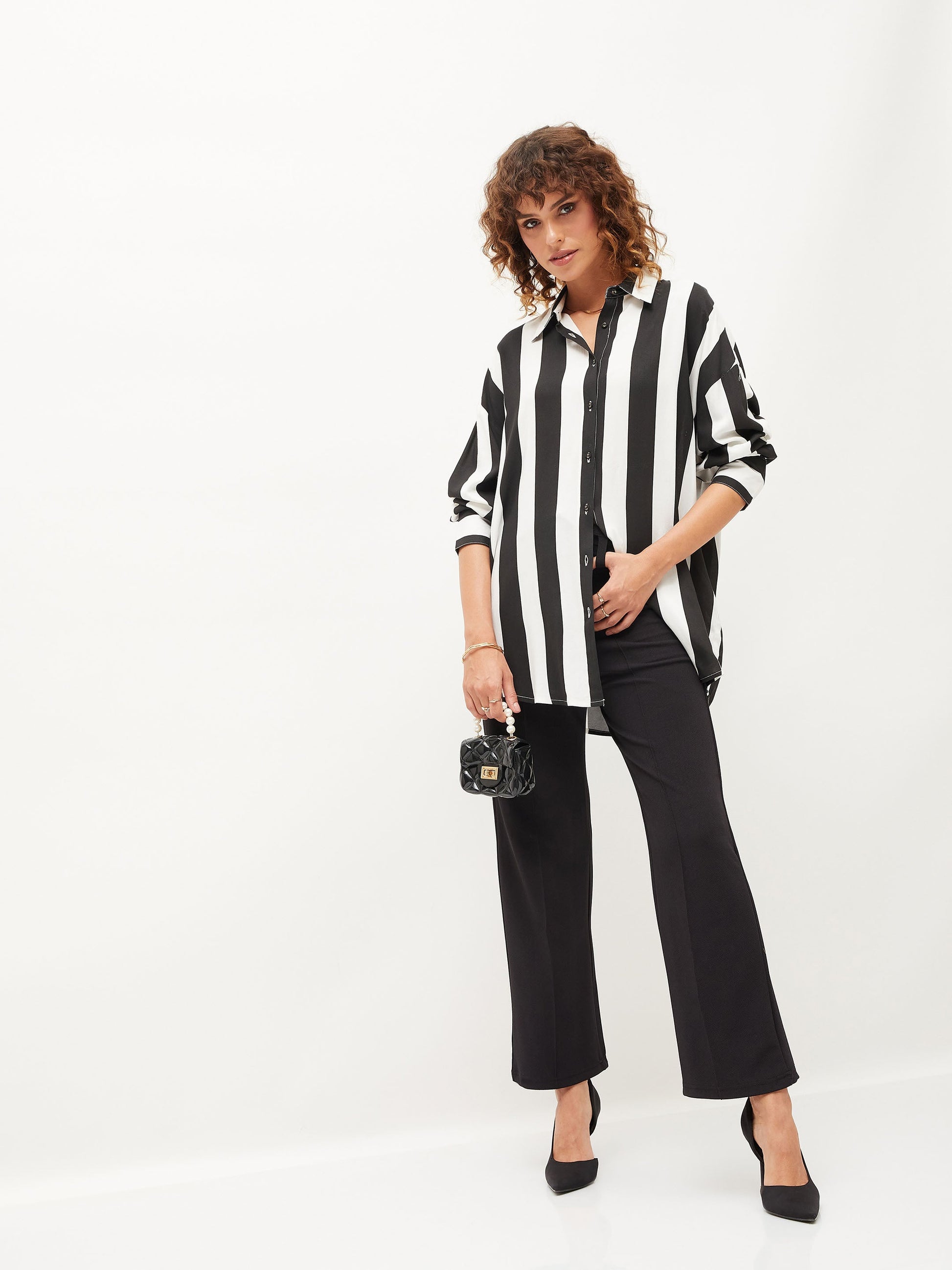 Black & White Striped Oversize Shirt, in Rayon fabric, Unlined, Regular Length, Loose Fit, Button Closure, Curved Hemline and features Slit At Front