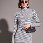 Black & White Striped Rib High Neck Front Zipper Top, in Rib fabric, Unlined, Regular Length, Slim Fit, Zipper Closure, Straight Hemline and features Concealed Zip Detail At Neck