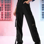 Black Zipper Pocket Cargo Straight Jeans , in Denim fabric, Unlined , Full Length , Straight Fit, Button Closure, Straight Hemline and features Flap & Buckle Detail At Sides
