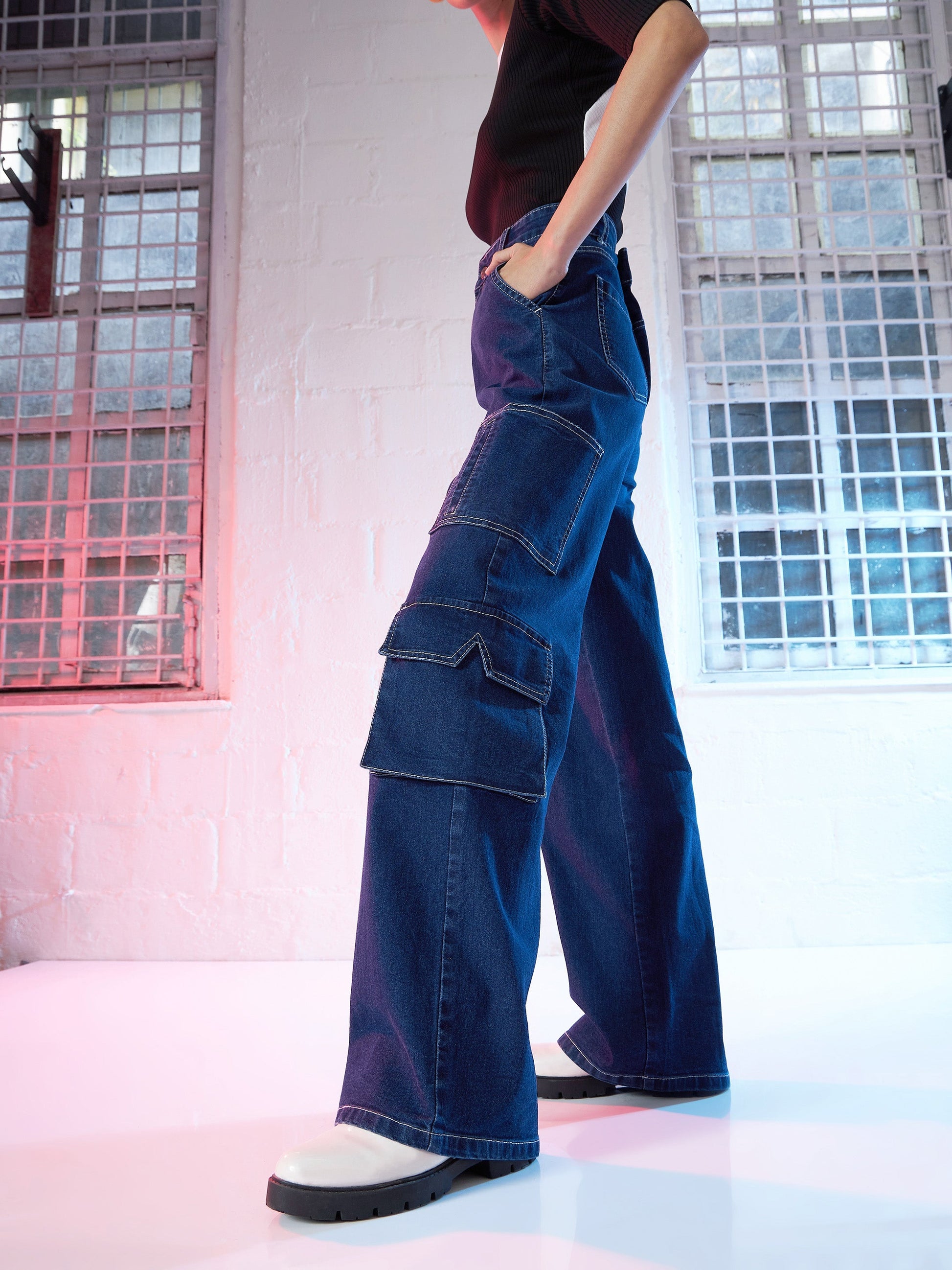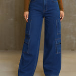 Blue Boxy Pockets Cargo Jeans , in Denim fabric, Unlined, Full Length, Straight Fit, Button Closure, Straight Hemline and features Dart Detail At Front