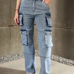 Blue Cargo Pockets Jeans, in Denim fabric, Unlined, Full length, Relaxed Fit, Zipper Closure, Straight Hemline and features Pocket At Side