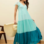 Women Blue Color Blocked Frill Sleeves Tiered Maxi Dress