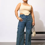 Women Blue Denim Acid Wash Flap Pocket Cargo Jeans