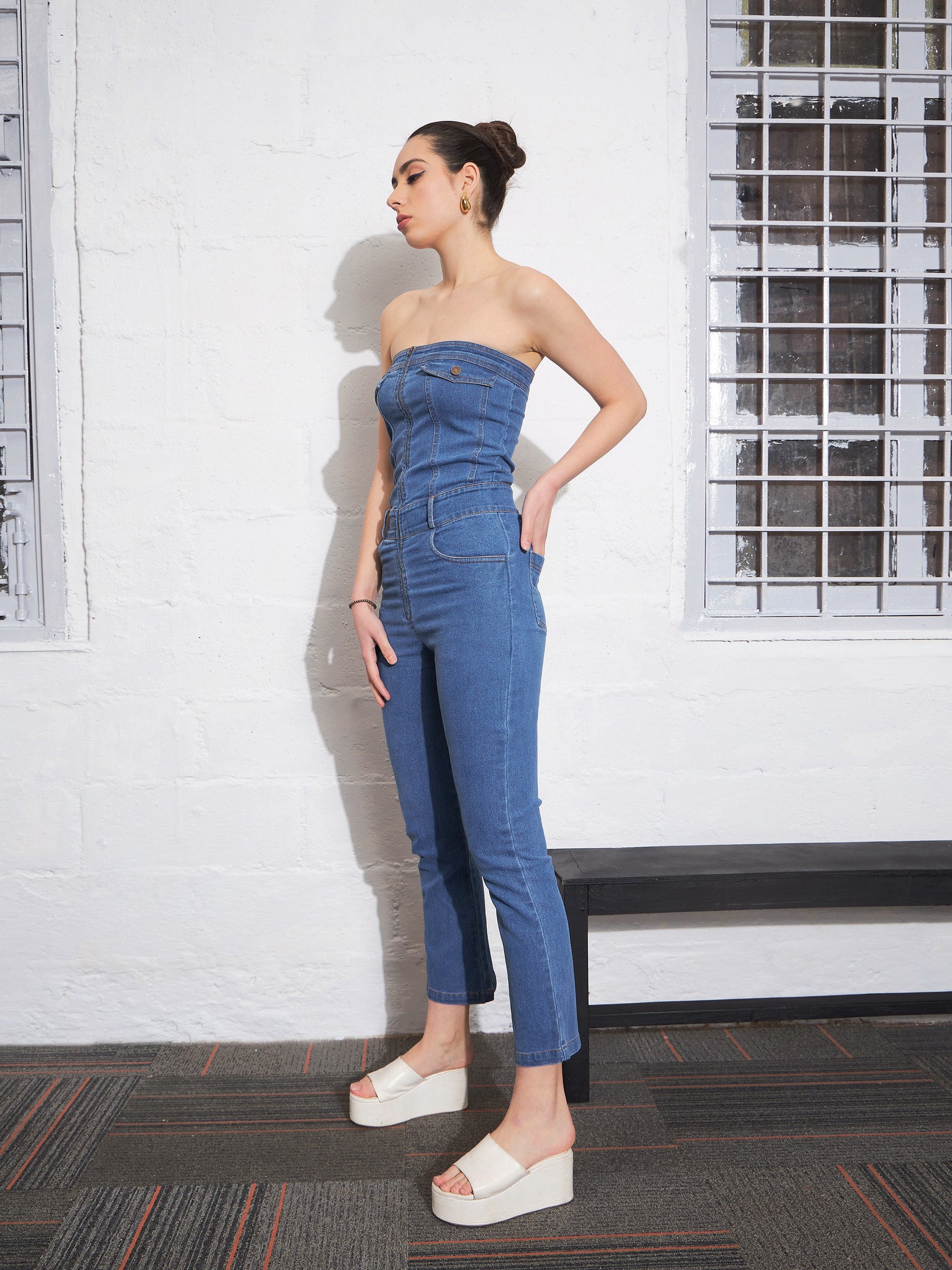Blue Denim Off-Shoulder Corset Jumpsuit, in Lycra Denim fabric, Unlined, Ankle Length, Regular Fit , Zipper Closure, Straight Hemline and features Flap Detail At Chest