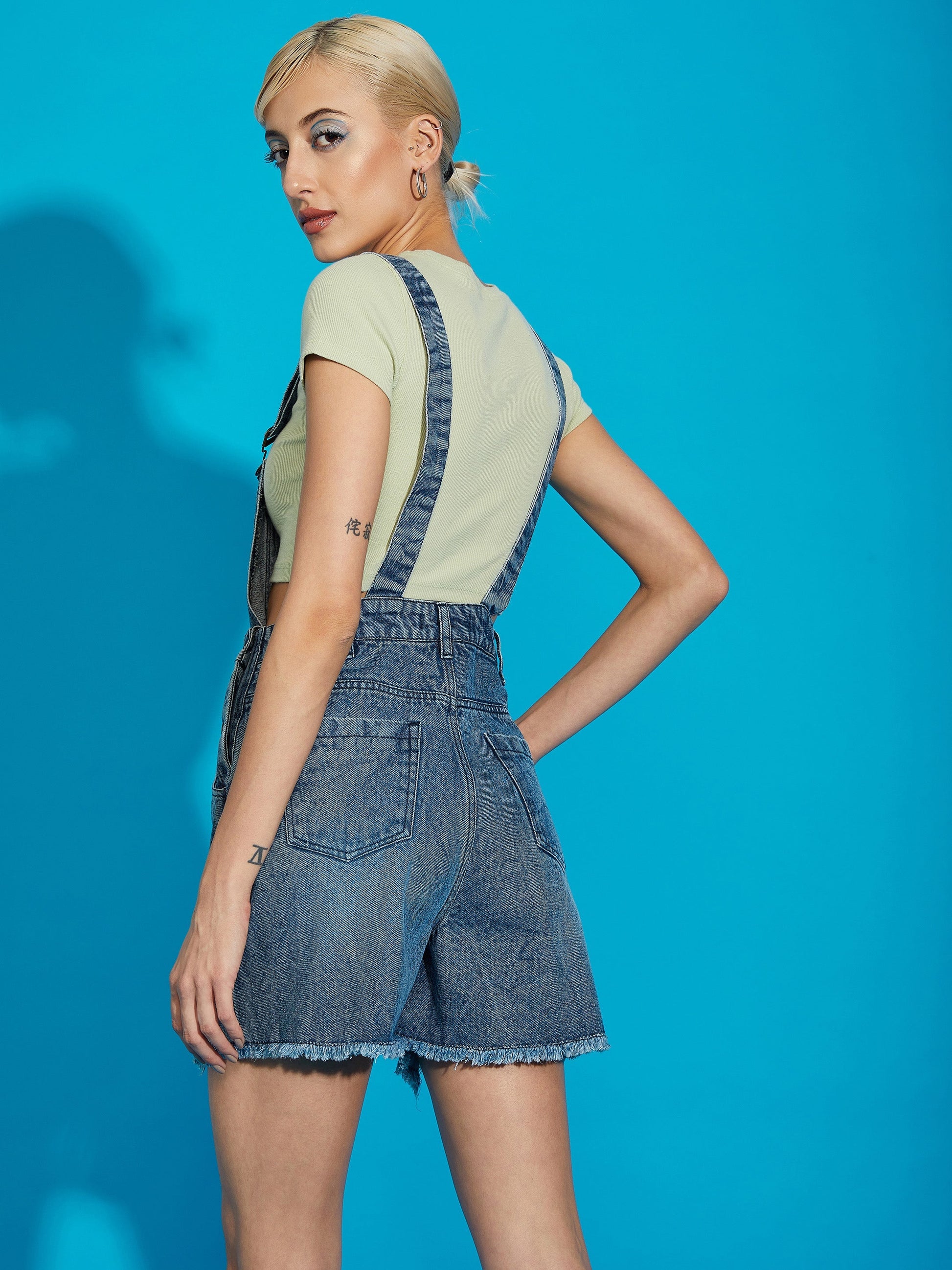 Blue Denim Distress Dungaree, in Denim fabric, Unlined, Thigh Length, Comfort Fit, Button Closure, Straight Hemline and features Heavy Distress Detail At Front