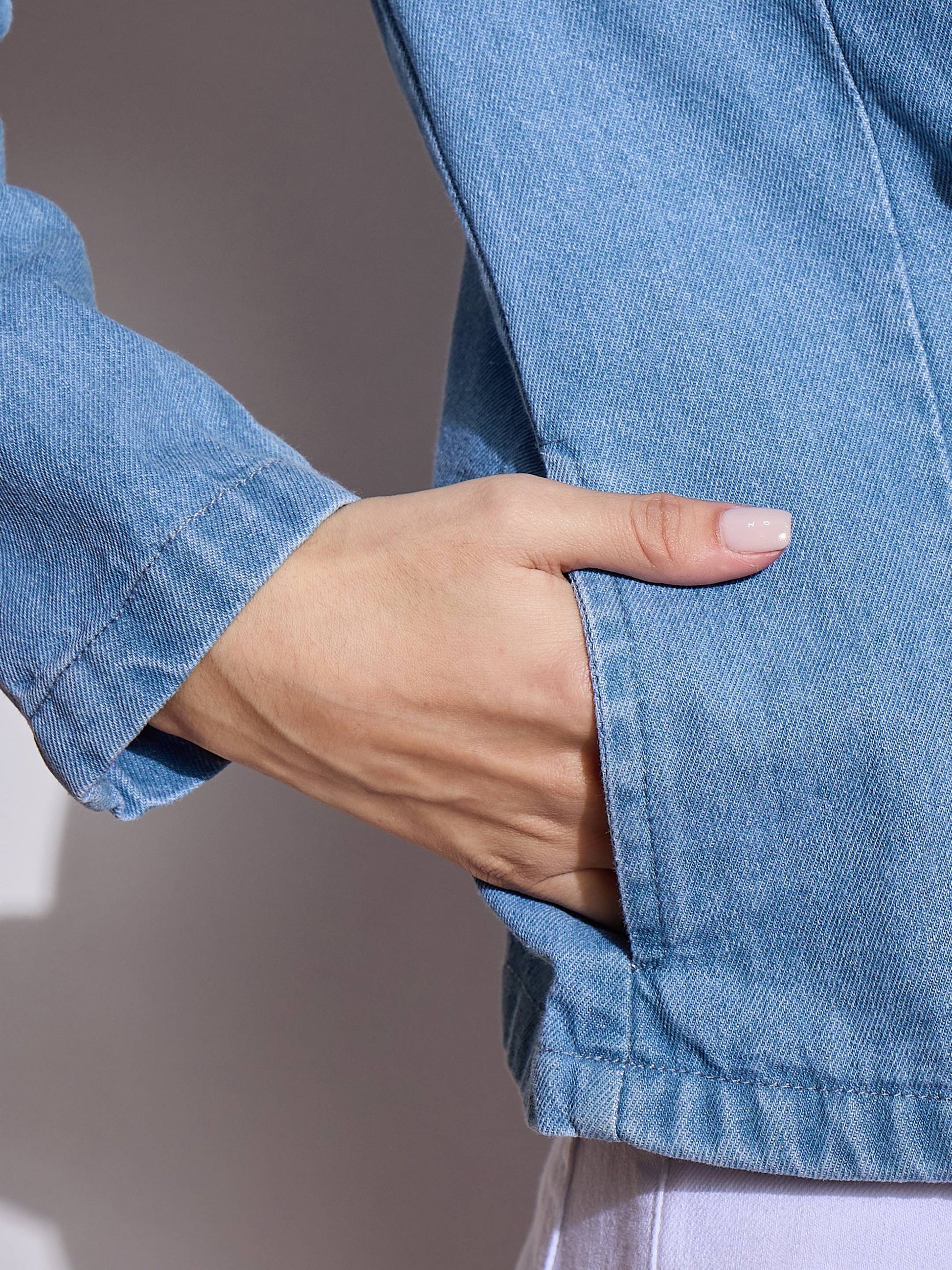 Women Blue Denim Front Button Notch Collar Crop Blazer