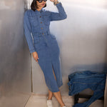 Blue Denim Front Slit Midi Dress, in Denim fabric, Unlined, Below Knee, Comfort Fit, Button Closure, Straight Hemline and features Patch Pocket At Front