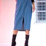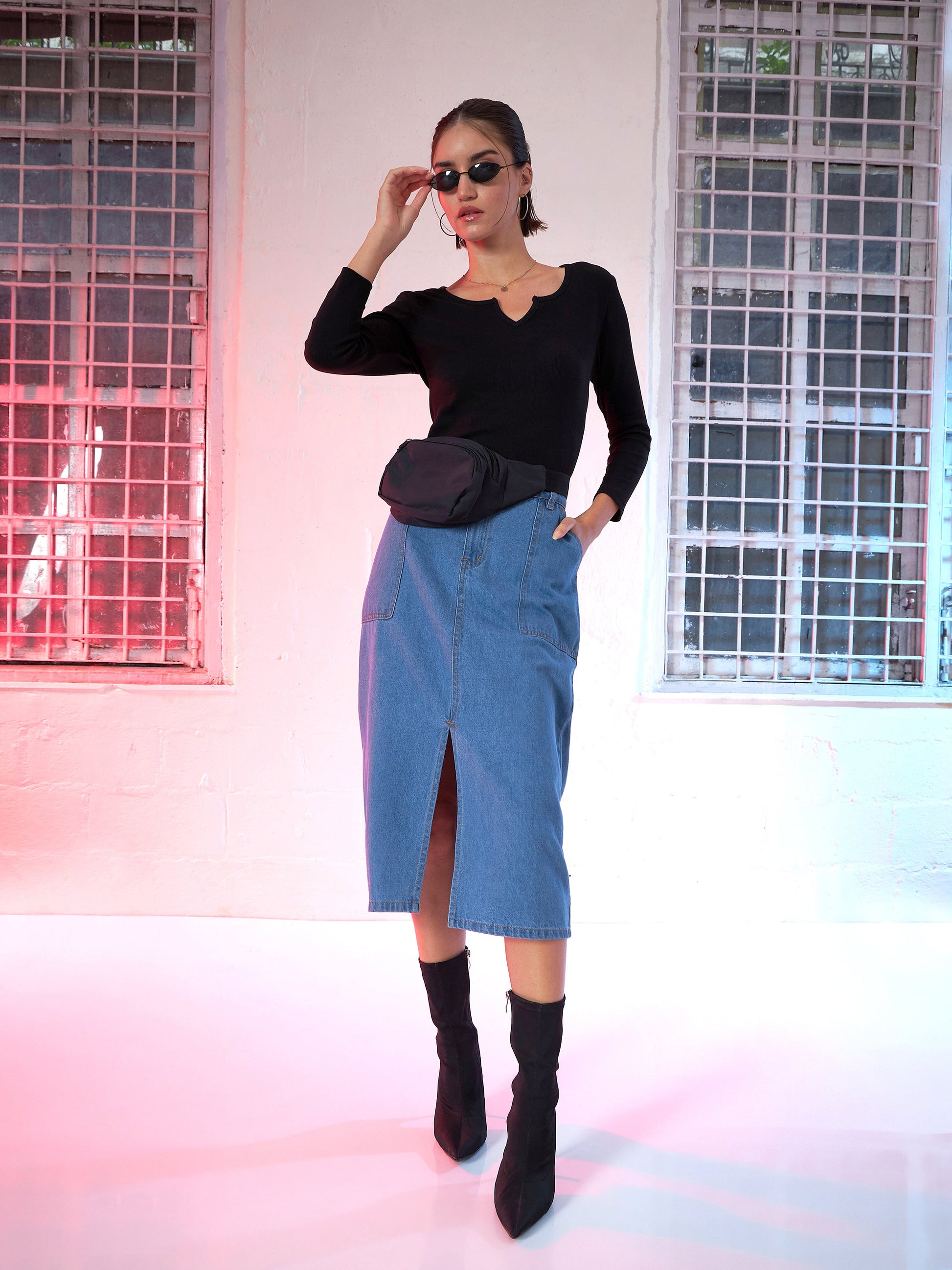 Blue Denim Front Slit Skirt, in Denim fabric, Unlined, Below Knee, Straight Fit, Button Closure, Straight Hemline and features Slit At Front