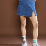 Blue Denim Front Slit Skorts, in Denim fabric, Unlined, Above Knee, Comfort Fit, Zipper Closure, Straight Hemline and features Slit Detail At Front