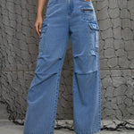 Women Blue Denim Pleated Knee Cargo Jeans