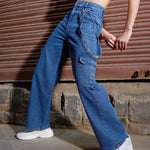 Blue Denim Side Patch Pockets Jeans, in Denim fabric, Unlined, Full Length, Comfort Fit, Button Closure, Straight Hemline and features Loop Detail At Side