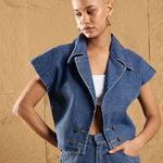 Blue Denim Washed Front Open Crop Gilet, in Denim fabric, Unlined, Crop Length, Comfort Fit, NA, Straight Hemline and features Button Detail At Front