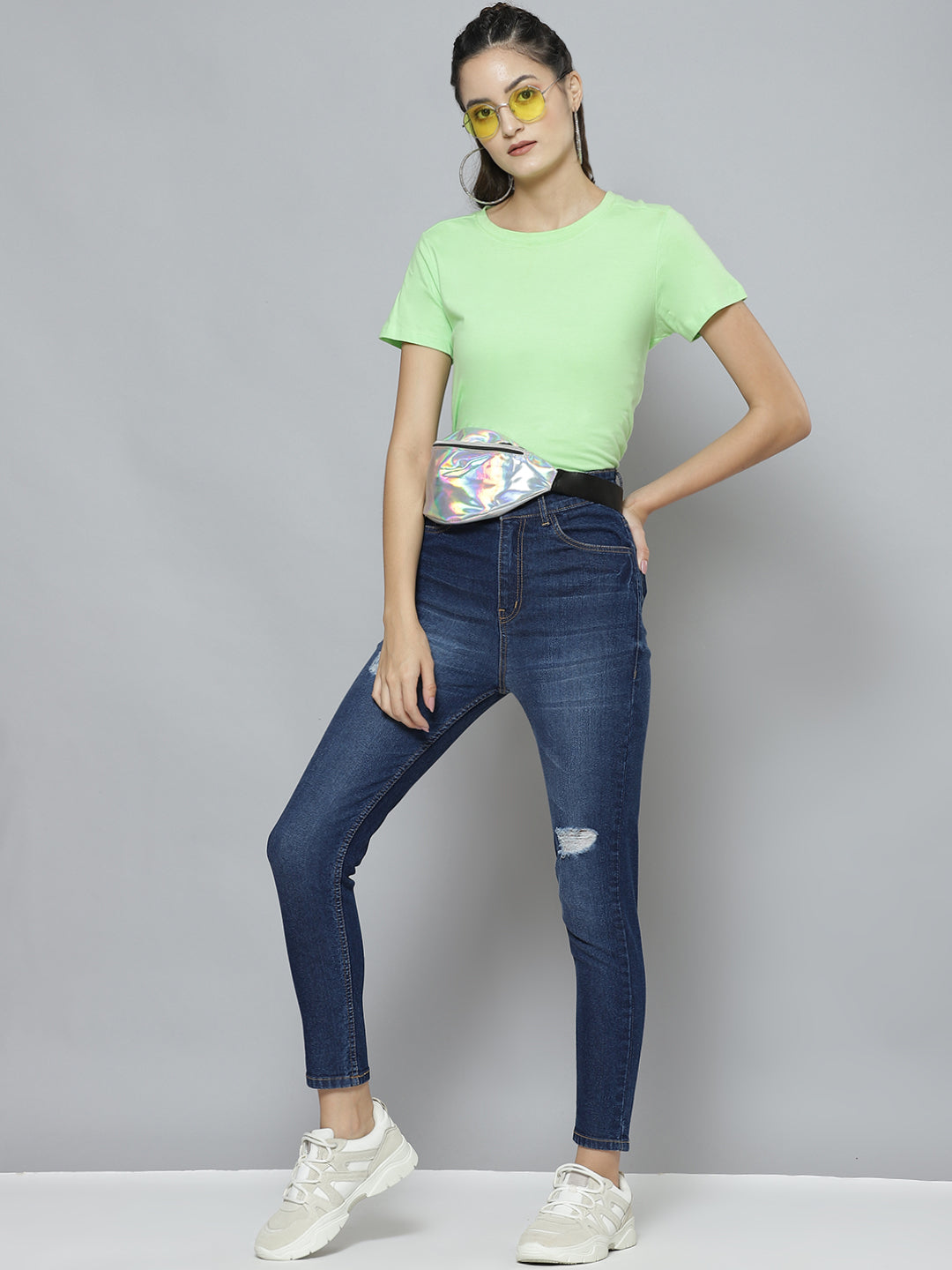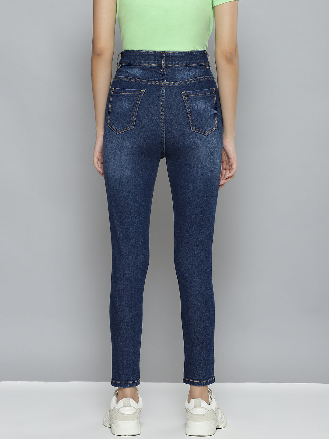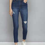 Blue Distressed Slit Jeans, in Denim fabric, Unlined, Ankle Length, Slim Fit, Button Closure, Straight Hemline and features Slit On Knee