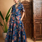 Blue Floral Anarkali Skirt With Blazer, in Poly Silk fabric, Butter Crepe Lining, Regular Length, Comfort Fit/ Fit & Flare, Button Closure, Straight Hemline and features Side Inlay Pocket Detail