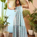 Blue Floral Back Less Maxi Dress, in Heavy Georgette fabric, Polyester, Full Length, Fit & Flare, No Closure, Flared Hemline and features Criss-Cross Dori Detail At Back