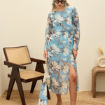 Blue Floral Front Yoke Midi Dress, in Chiffon fabric, Polyknit Lining, Below Knee, Fit & Flare, Button Closure, Flared Hemline and features Key Hole Detail At Back