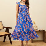 Women Blue Floral Smocked Frill Midi Dress