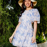 Women Blue Floral Waist Cut Out Skater Dress