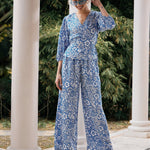 Blue Floral Wrap Top With Palazzos, in Poly Crepe fabric, Unlined, Regular Length Top and Full Length Pants, Comfort Fit, No Closure/Slip -on, Straight Hemline and features Wrap Detail At Front