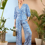 Blue Floral Wrap Top With Palazzos, in Poly Crepe fabric, Unlined, Regular Length Top and Full Length Pants, Comfort Fit, No Closure/Slip -on, Straight Hemline and features Wrap Detail At Front