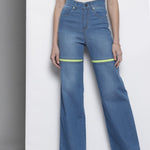Blue Front Zipper Stretch Straight Jeans, in Denim fabric, Unlined, Full Length, Comfort Fit, Button Closure, Straight Hemline and features Contrast Zipper Detail At Front