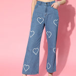 Blue Heart Print Wide Leg Jeans, in Denim fabric, Unlined, Full Length, Comfort Fit, Button Closure, Straight Hemline and features Heart Print Detail