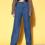 Blue Hem Pocket Stretch Straight Jeans, in Denim fabric, Unlined, Full Length, Straight Fit, Button Closure, Straight Hemline and features Pocket Detail At Hem With Neon Snap Buttons