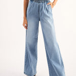 Blue High Waist Elasticated Jeans, in Denim fabric, Unlined, Full Length, Straight Fit , No Closure, Straight Hemline and features Elasticated Waist Detail