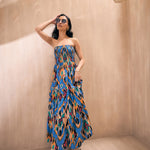 Blue Ikat Print Tube Maxi, in Cotton Cambric fabric, Cotton Voile, Maxi Length, Fit & Flare, No Closure, Flared Hemline and features Smocking Detail At Chest