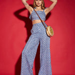 Blue Mughal Print Crop Top With Straight Pants, in Poly Crepe fabric, Unlined, Crop Length, Regular Fit, No Closure, Straight Hemline and features Strap Tie Detail At Shoulder/ Elastic At Back Waistband