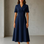 Blue Notch Collar Button Midi Dress, in Canton fabric, Unlined, Midi Length, Comfort Fit, Button Closure, Flared Hemline and features Button Detail