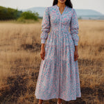 Blue Paisley V-Neck Gathered Maxi Dress, in Cotton Cambric fabric, Cotton Voile, Maxi Length, Comfort Fit , No Closure, Flared Hemline and features Lace Detail At Front Neck