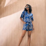 Women Blue Poplin Floral Notch Collar Shirt With Shorts