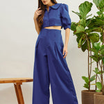 Blue Poplin Peterpan Collar Top With Flared Pants, in Poplin fabric, Unlined, Crop Length, Regualr Fit, Button Closure, Straight Hemline and features Lace Detai At Collar / Pleate At Front