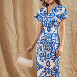 Blue Printed V-Neck Bodycon Dress, in Canton fabric, Unlined, Maxi Length, Slim Fit, Zipper Closure, Straight Hemline and features Wrap Detail At Front